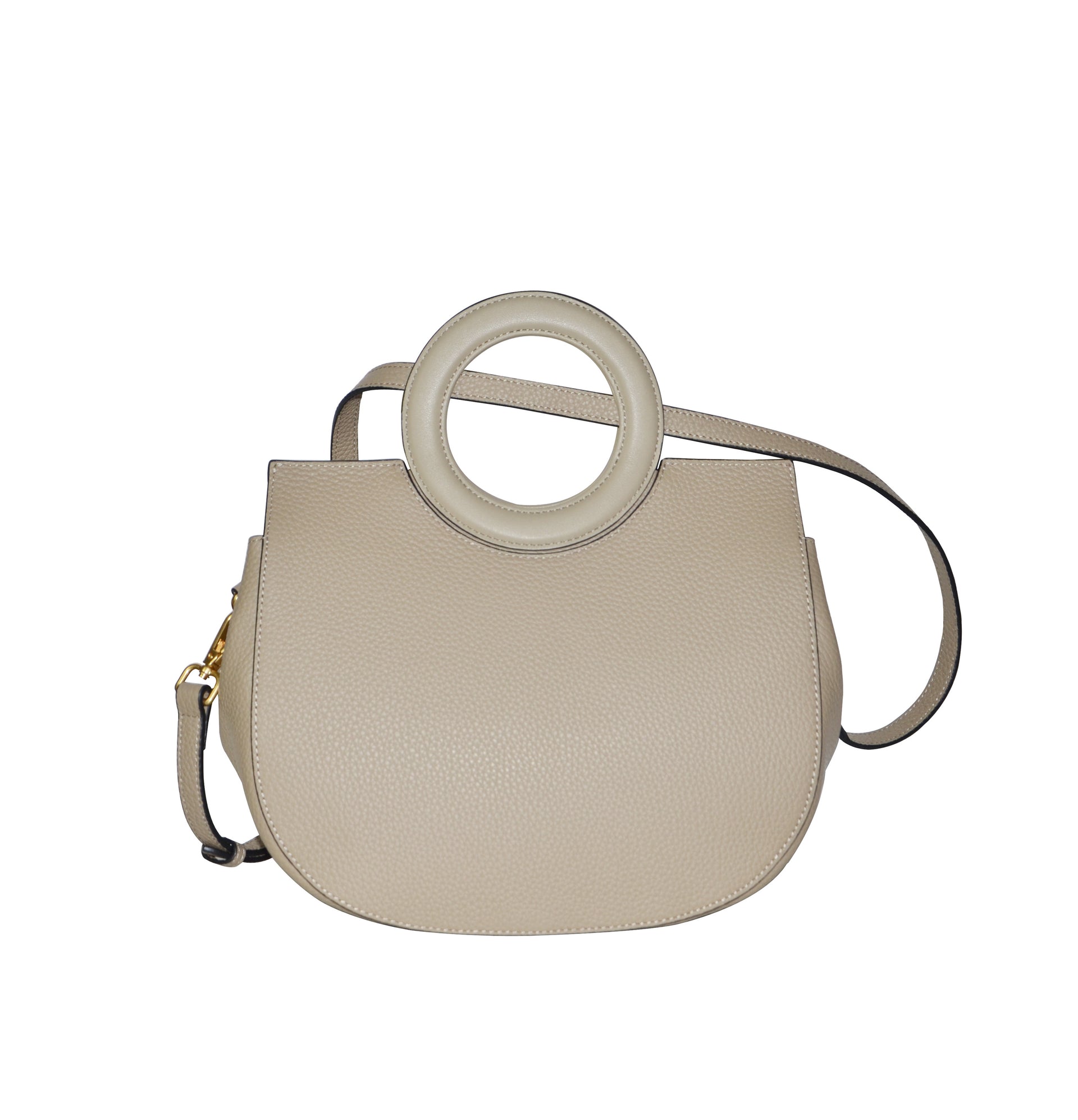 Milan Moon Bag features double handles and an adjustable, detachable shoulder strap, allowing for versatile wear as a shoulder bag, crossbody, or hand carry.